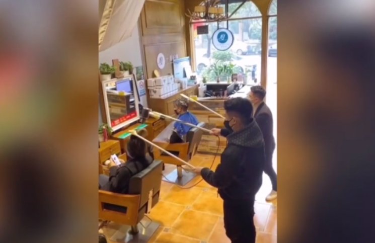 Los estilistas del sur de China decidieron no solo no darle la mano a sus clientes, sino que fueron más allá para mantener una distancia segura: unieron sus herramientas al extremo de largos palos y así lavan, cortan y peinan.