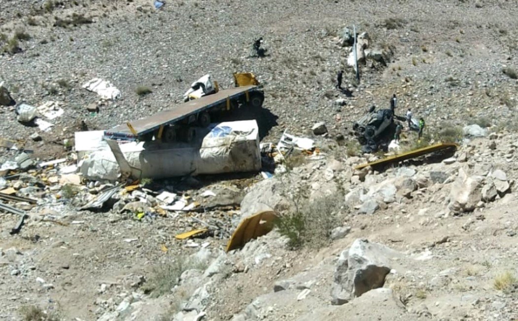 Este domingo al mediodía ocurrió un fuerte choque en la Ruta Internacional 7 camino a Chile. Un camión impactó y arrastró a un barranco a dos autos. Varios heridos, dos de gravedad que fueron trasladados en el helicóptero. El tránsito está interrumpido.