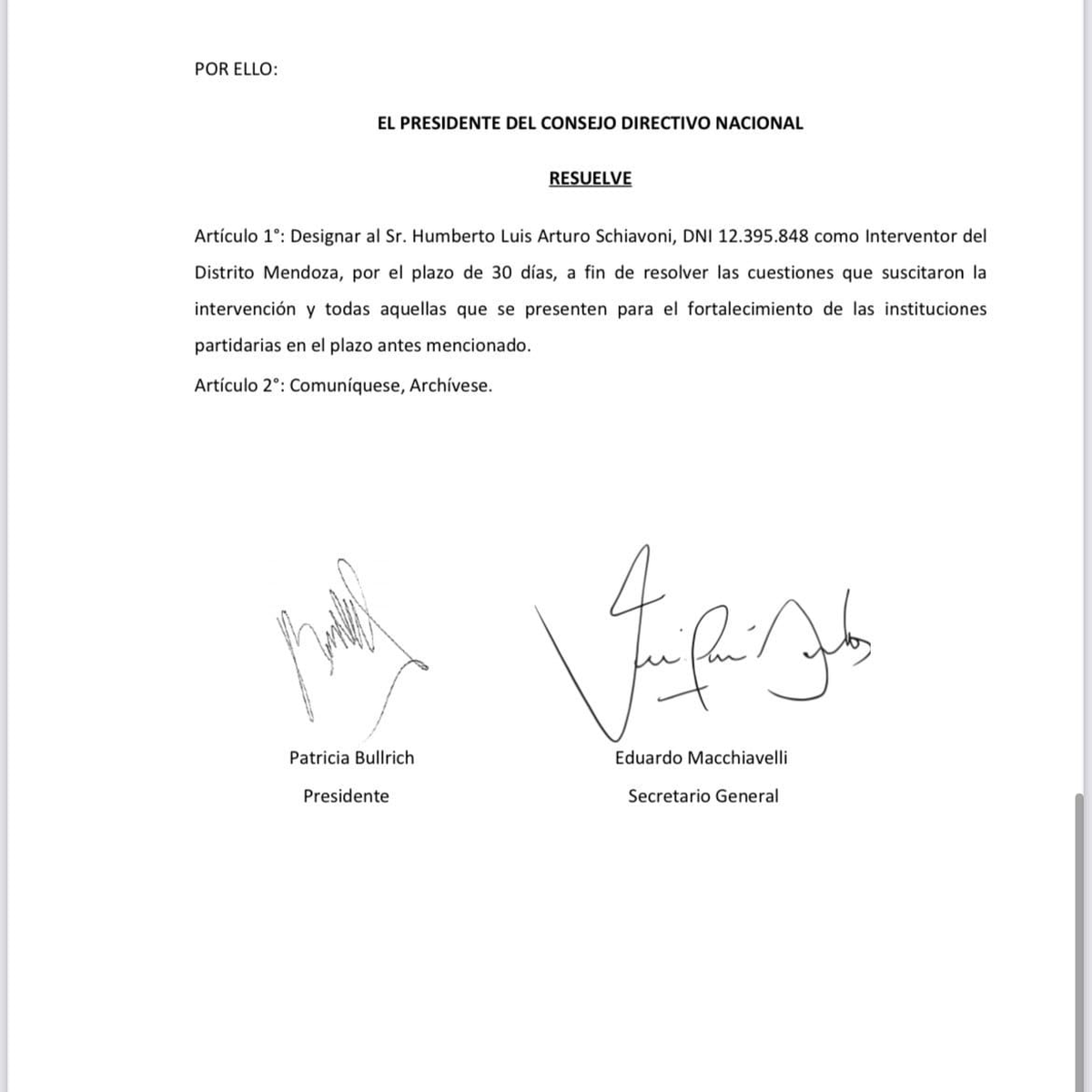 Después de que se resolvió la intervención del PRO mendocino, desde el sector bullrichista circuló parte de la resolución en la que se confirmaba la intervención ordenada por las autoridades nacionales durante 30 días (plazo en el que hay que conformar frentes y listas para las elecciones provinciales) y se nombraba como responsable a Humberto Schiavoni para «resolver las cuestiones que suscitaron la intervención y todas aquellas que se presenten para el fortalecimiento de las instituciones partidarias».