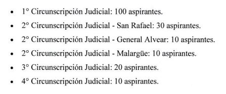 Desde el viernes 14 y hasta el domingo 23 de abril, tendrán tiempo de inscribirse quienes aspiren a uno de estos 200 puestos de trabajo que luego tendrán un cargo de auxiliar administrativo. El formulario de inscripción deberá completarse a través de la página web del Poder Judicial de Mendoza en este enlace.