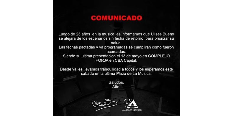 Luego de un gravísimo problema de salud que lo obligó a suspender todos sus shows, Ulises Bueno sorprendió a sus fanáticos al anunciar que dejará los escenarios por tiempo indeterminado, haciendo temer que nunca más vuelva a presentarse en vivo.
