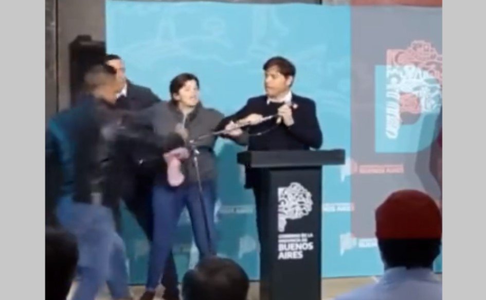 Un momento de tensión se vivió este jueves en la ciudad de Brandsen donde una mujer irrumpió a los gritos durante el discurso que daba el gobernador de la provincia de Buenos Aires, Axel Kicillof, en dicha ciudad bonaerense. En consecuencia, fue reducida por su personal de seguridad, que la retiró del lugar y luego la liberó.