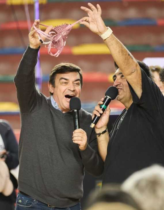 Esa descripción acompaña a un carrete de fotos que publicó un reportero gráfico en su Instagram y en el que puede verse, justamente, al candidato a la Gobernación de la provincia por La Unión Mendocina, Omar De Marchi, sosteniendo un micrófono y mostrando bombachas de distintos colores -en las diferentes imágenes- mientras conduce ese bingo, que se realizó en el Estadio Polimeni.