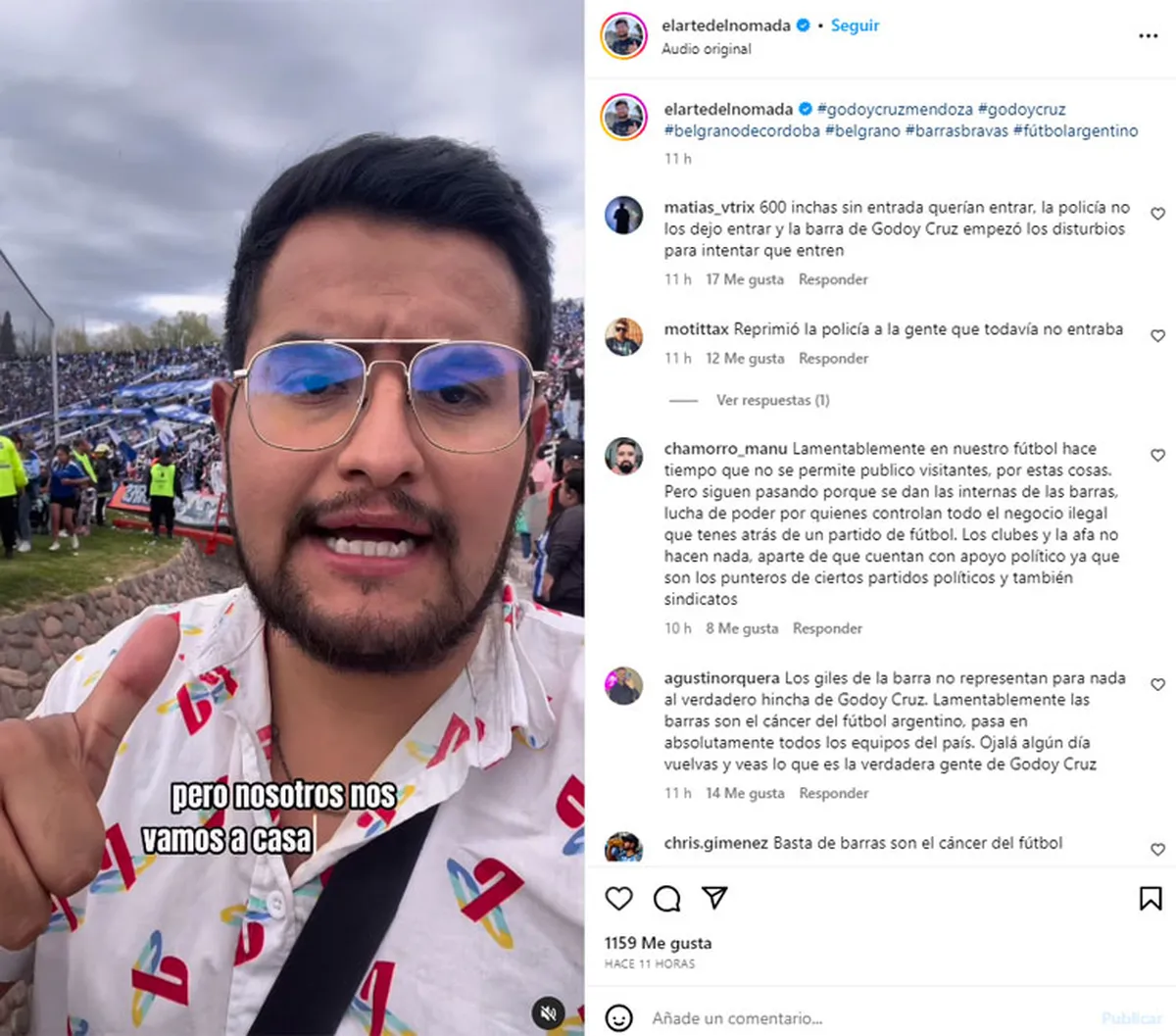 «La gente me cayó muy bien y me trataron superbien. Desconozco las razones pero se armó una batalla fuera del estadio», contó la cara visible de la cuenta @elartedelnomada.