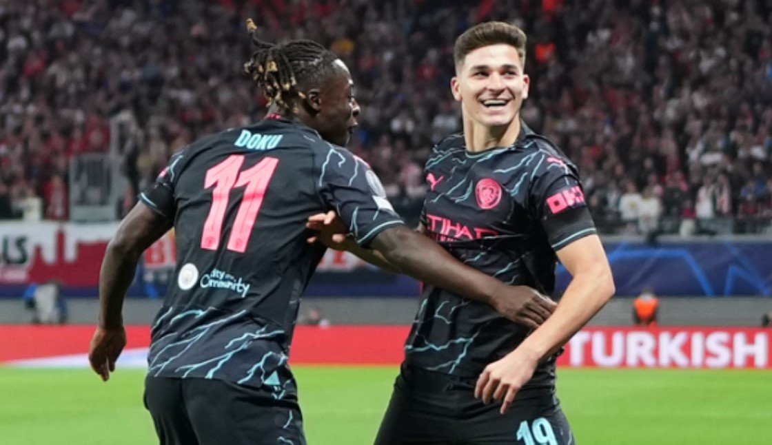 Manchester City 🏴 le ganó 1-3 Leipzig 🇩🇪 y es puntero del Grupo G de la Champions League ¿Julián Álvarez 🇦🇷? Una definición preciosa y este pase gol para Doku. Los restantes fueron de Foden y Openda. pic.twitter.com/S5PYGwxLqk