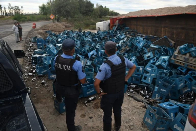 Un camión que transportaba cajones de cerveza volcó cerca del cruce de Ruta 40 y Ruta 34, en el departamento de Lavalle, en horas de la madrugada. Mientras que el conductor tuvo que ser hospitalizado debido a los golpes sufridos en el siniestro, transeúntes aprovecharon la ocasión para llevarse cajones y botellas.