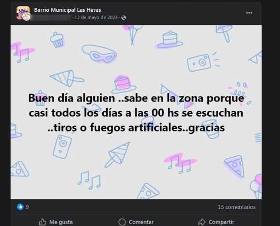 «Buen día, alguien sabe en la zona porque casi todos los días a las 00 hs se escuchan tiros o fuegos artificiales. Gracias», preguntan en las redes.