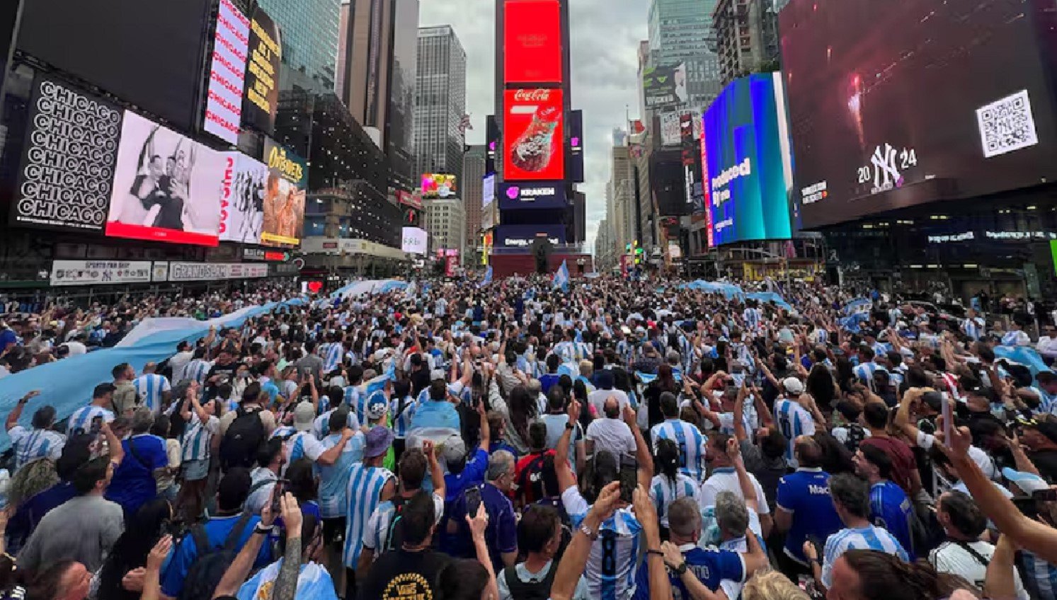 La movilización de los hinchas es pacífica, pero cabe destacar que la policía local no le permitió a la gente subirse a la tradicional escalinata roja de Times Square. La explosión popular se hizo sentir en el corazón de la Gran Manzana. La ciudad neoyorquina será sede del encuentro por la segunda fecha del Grupo A del torneo donde la Argentina defiende el título.