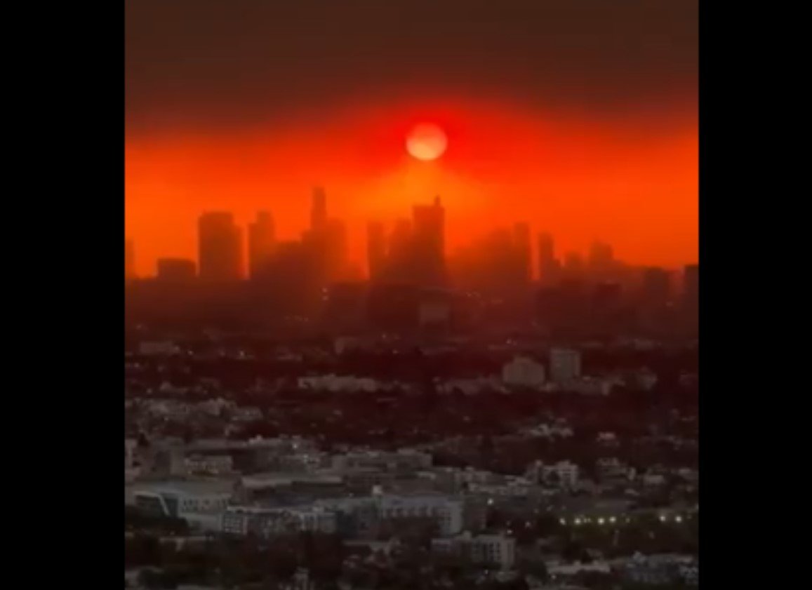 Un amanecer casi apocalíptico en Los Ángeles, California, mientras el humo de los incendios forestales cubre el cielo. La persona que graba dice que nunca había visto algo así en todos los años que lleva viviendo allí. “Hay tanto humo que bloquea el sol". pic.twitter.com/R83Xt7xbAE