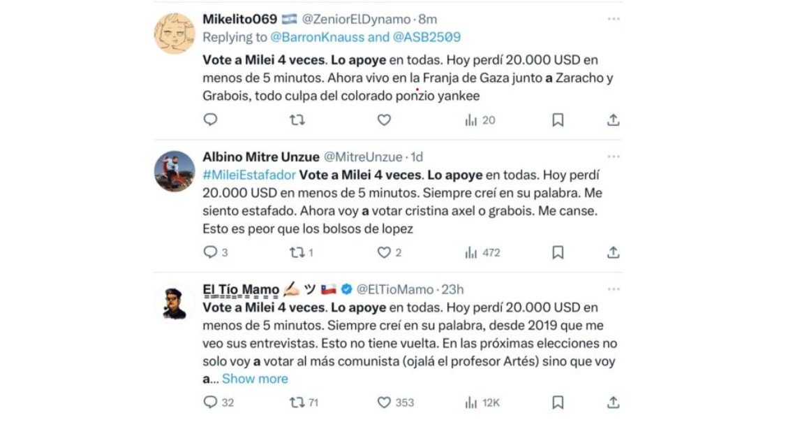 En las últimas horas, ususarios de la red social X (ex Twuitter), reportaron mensajes iguales de diferentes usuarios, sobre el escándalo que desató la publicación del presidente Milei, sobre el denominado caso $LIBRA.
