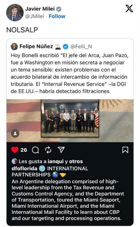 Según supo Noticias Argentinas, el exabrupto del mandatario en la red social X fue para respaldar una desmentida a una nota del periodista Marcelo Bonelli sobre un viaje del titular de la ARCA, Juan Pazo, a Estados Unidos. El acrónimo «NOLSALP» que utilizó el Presidente significa «No Odiamos Lo Suficiente A Los Periodistas».