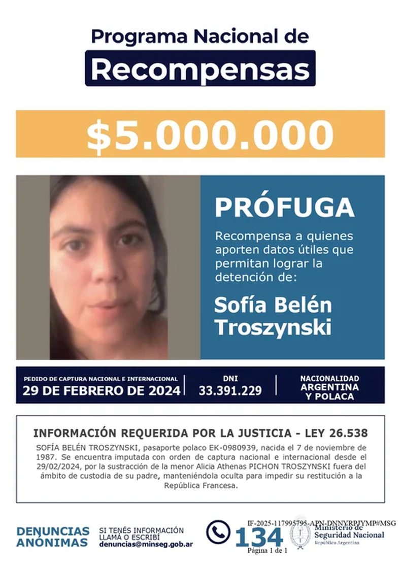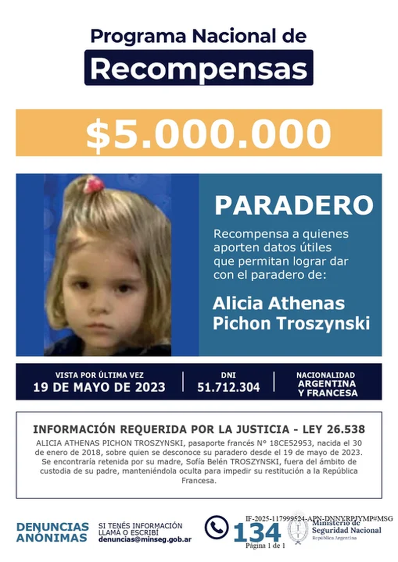 Este martes, el Ministerio de Seguridad Nacional emitió una resolución a través de la cual ofrece una millonaria recompensa para quienes aporten datos sobre el paradero de Alicia Athenas Pichon Troszynski, la niña que fue secuestrada por su mamá Sofía Belén Troszynski, quien posee una orden de captura nacional e internacional.
