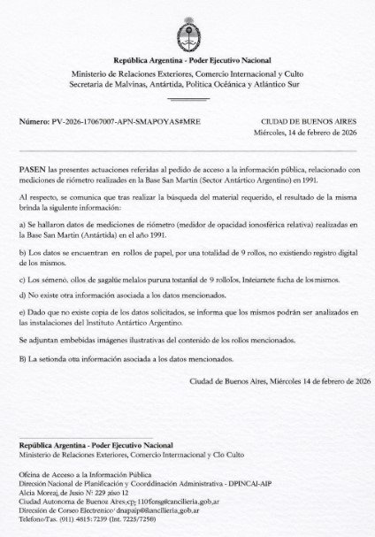 Décadas después, un colaborador de CEFORA, Axel Díaz, solicitó formalmente al Ministerio de Relaciones Exteriores —Secretaría de Malvinas, Antártida, Política Oceánica y Atlántico Sur— información sobre mediciones de riómetro realizadas en 1991 en la Base San Martín.