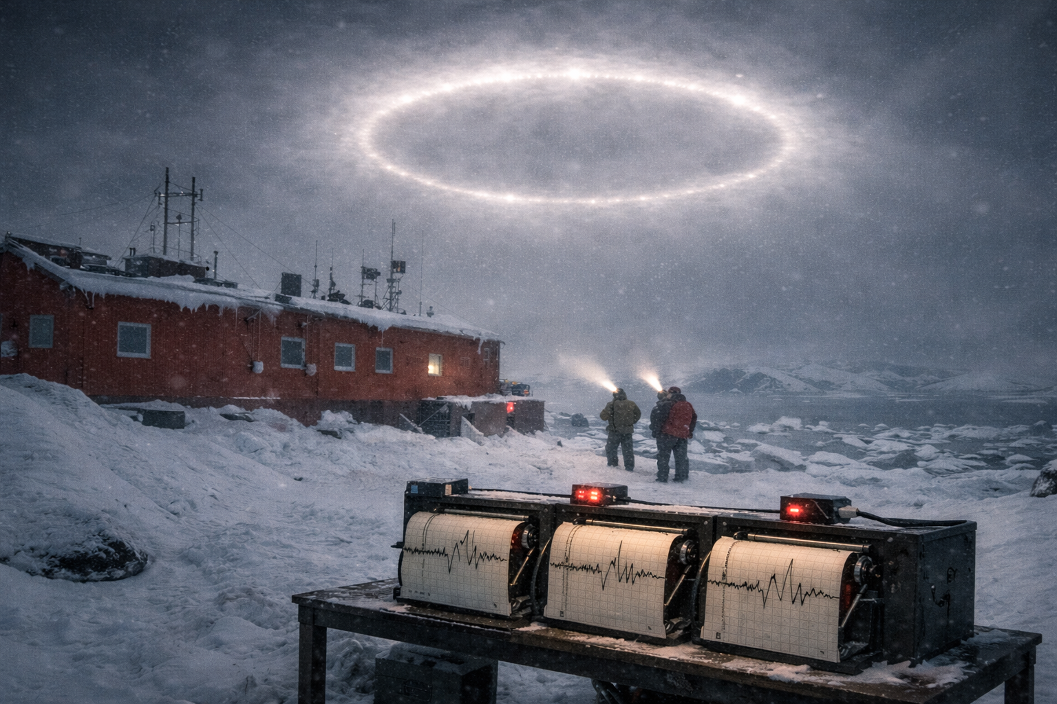 Cerca de la 01:00 de la madrugada, en el laboratorio científico de la base, un riómetro —instrumento que mide la opacidad ionosférica relativa— comenzó a registrar señales inusuales. Los científicos conectaron un sistema de registro gráfico con tres brazos trazadores, similares a un sismógrafo. Lo que observaron los desconcertó: las tres agujas comenzaron a realizar trazos idénticos, algo que, según el ingeniero a cargo, era técnicamente imposible.